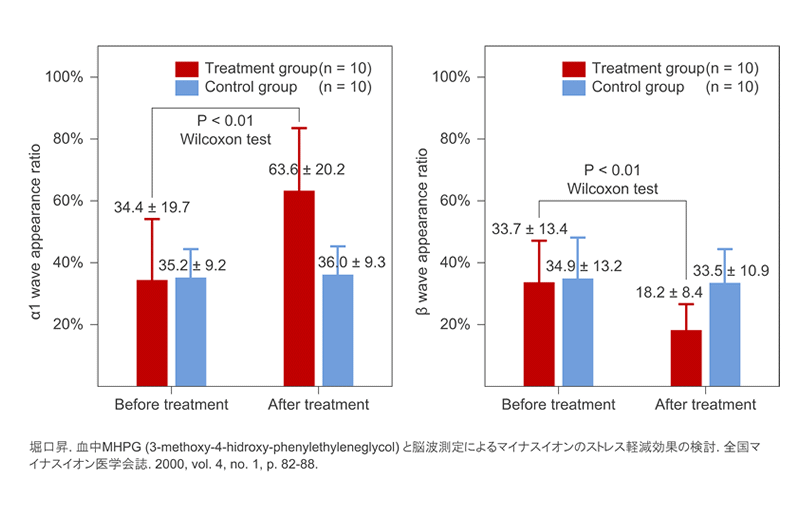 Biểu đồ phía dưới cho thấy sự thay đổi của tỷ lệ xuất hiện sóng não (α1 và β) sau khi sử dụng thiết bị trị liệu khử electron trong khoảng 15 phút. Sóng α1 được phát ra khi chúng ta ở trong trạng thái nghỉ ngơi hoặc thư giãn. Còn sóng β xuất hiện khi chúng ta bồn chồn hoặc lo lắng hay cả hai.